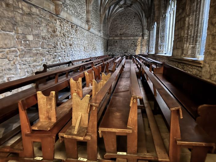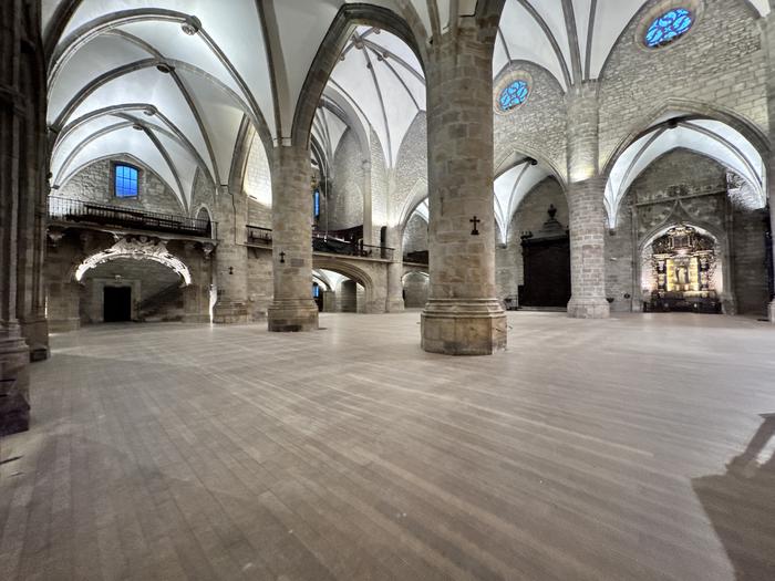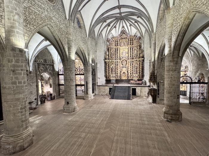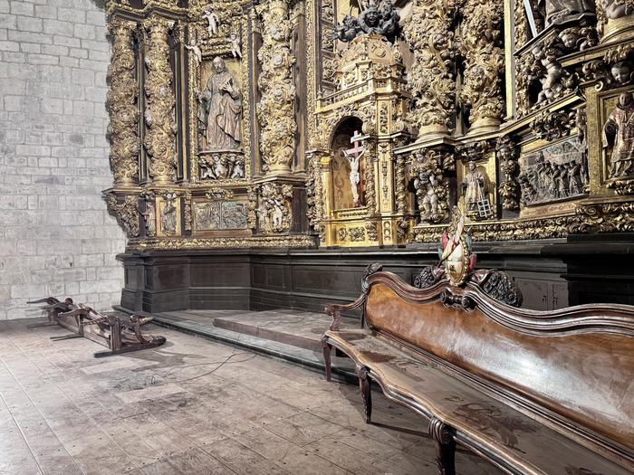 Guztira 80 bat eserleku egoten dira; 22 banku dituzten hiru ilara, batetik, eta alboetakoak gehitu behar zaizkie horiei. Denak erretiratu dituzte erdigunetik eta izkinetatik, eta klaustroan gorde dituzte; hortxe egongo dira lurra berritzeko lanak egin arte.